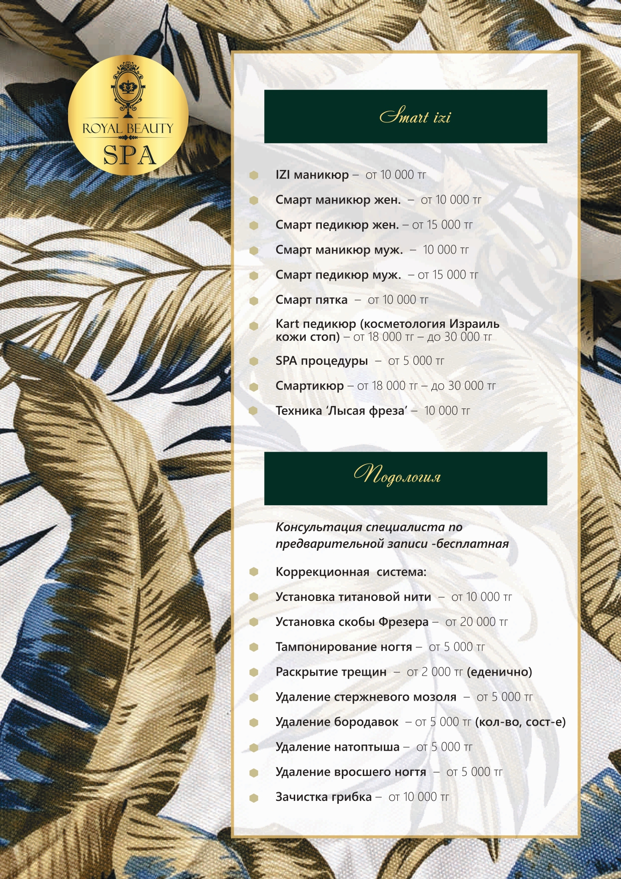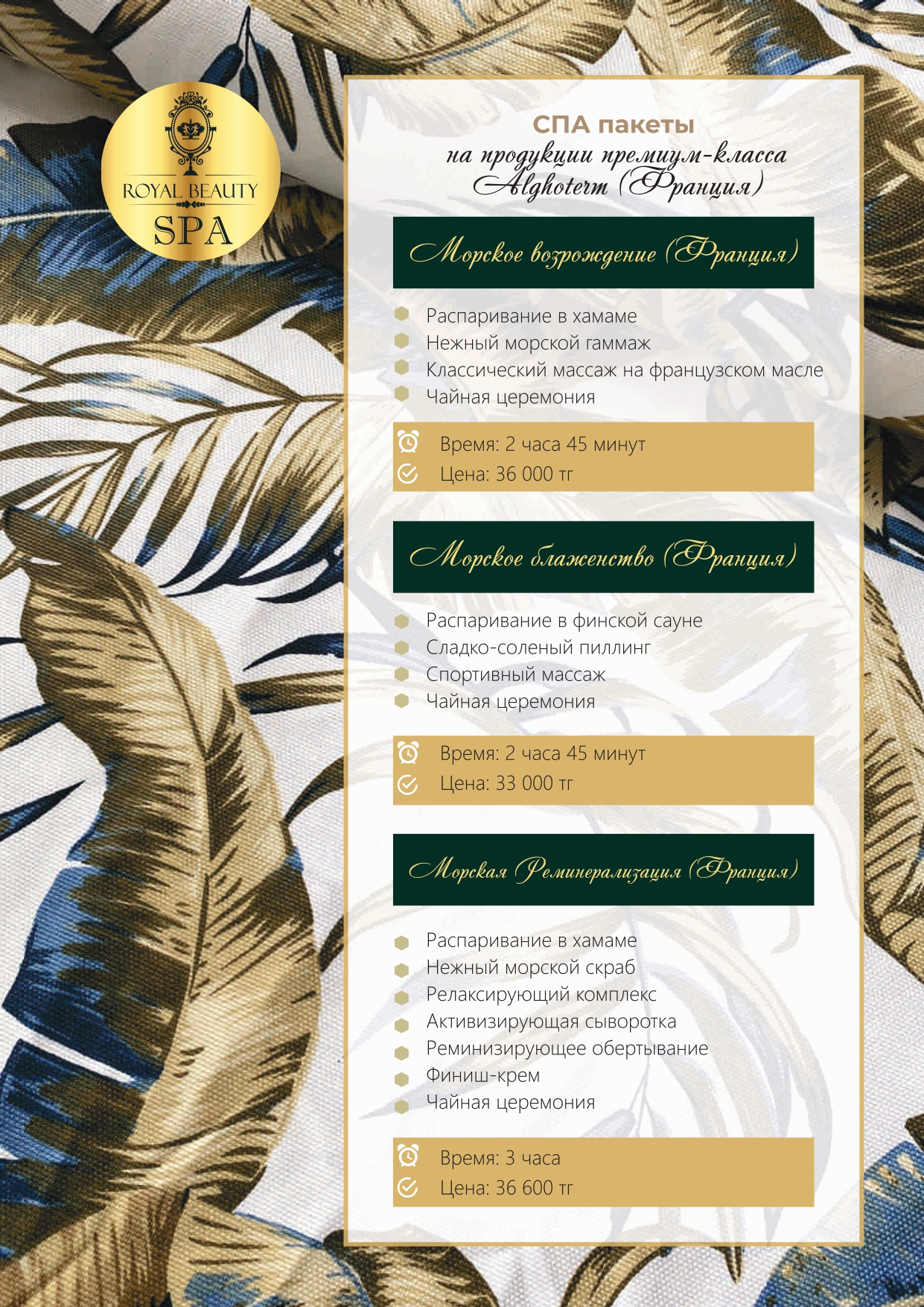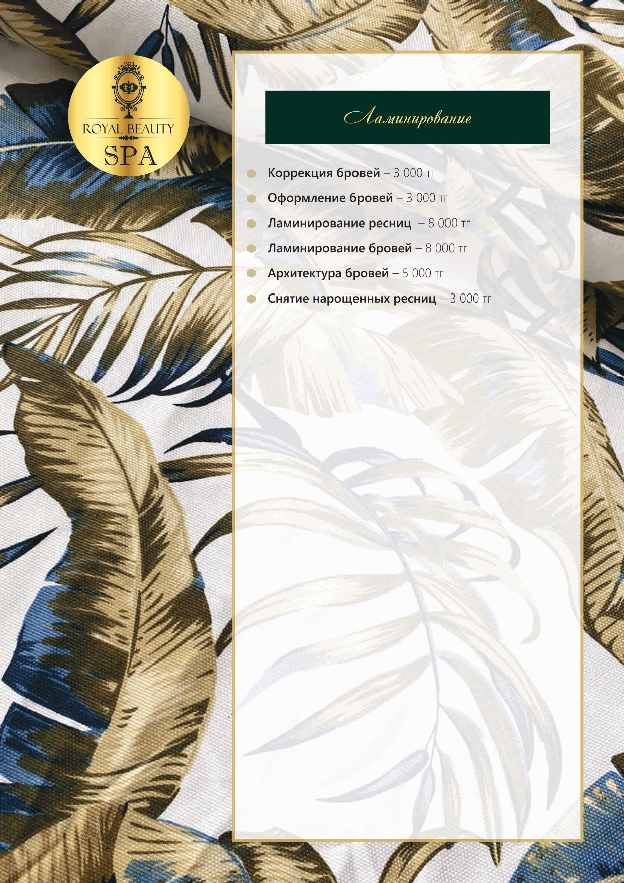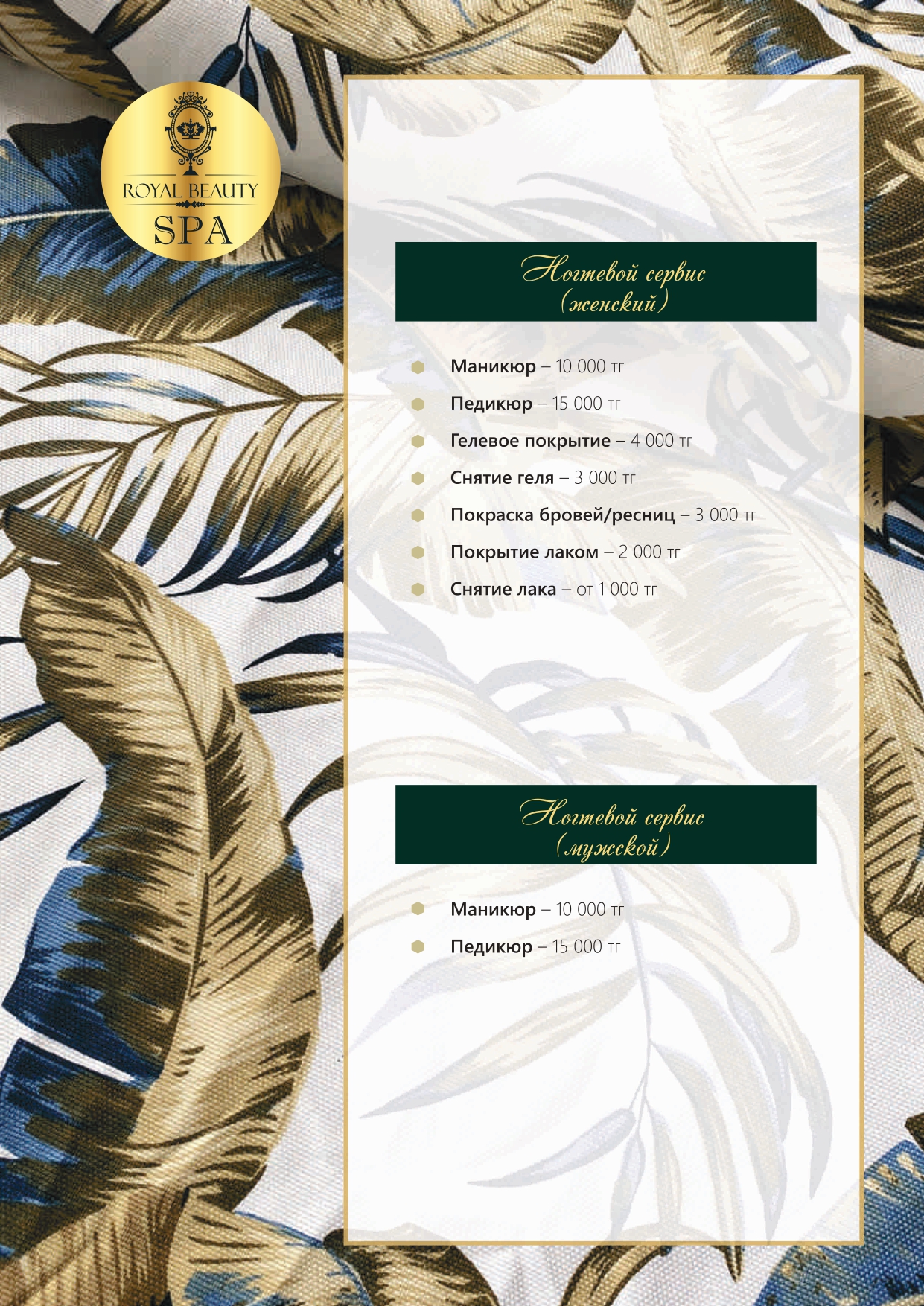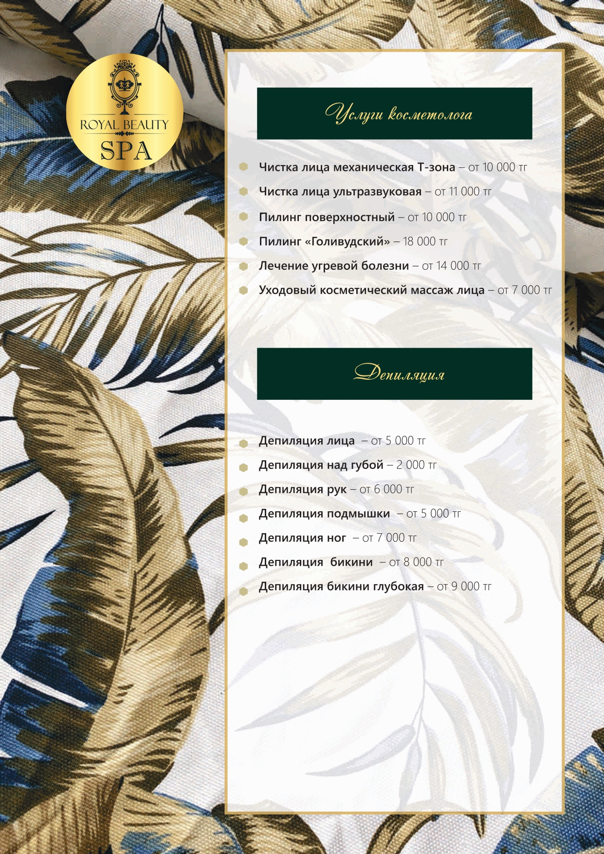 Royal Beauty SPA сұлулық институты — өзіне және жақындарына шынайы мән беретіндерге арналған орын. Денсаулықты, сұлулықты және энергияны ұзақ жылдар бойы сақтау үшін шабыт береді. Жаттығудан шыққаннан кейін, сүйікті клубтан шықпай-ақ — шаштың ұшынан тырнақ шетіне дейін люкс-күтім сыйлаймыз